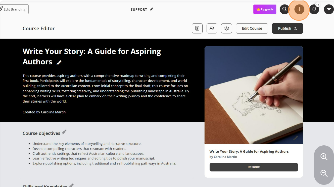 From anywhere in Coursebox, go to the top-right navigation bar and click the + (plus) icon.