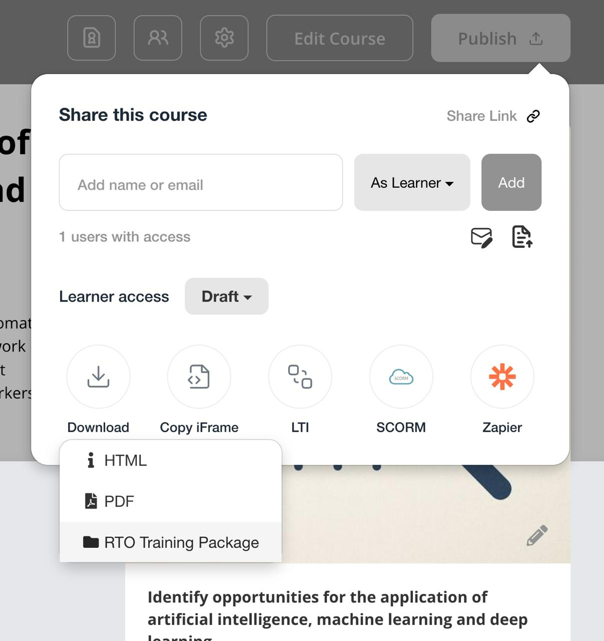 Coursebox generates a suite of training and assessment materials to support delivery of nationally recognised units of competency. This feature is only available for Australian users.