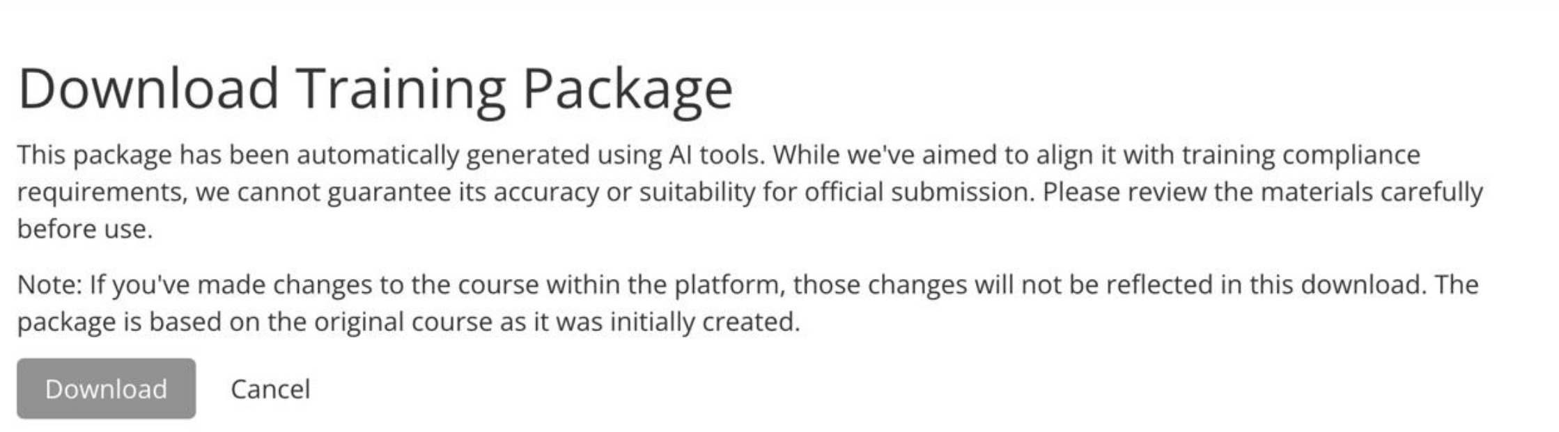A confirmation message will appear reminding you that the package has been AI-generated and should be reviewed for compliance.
