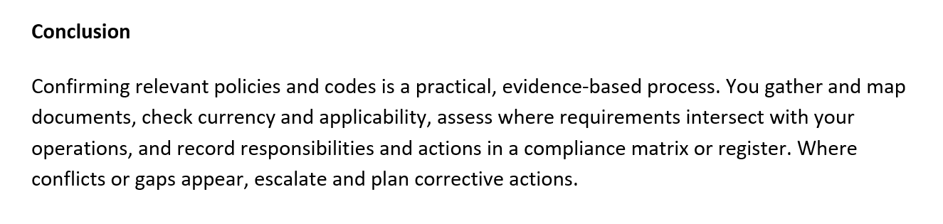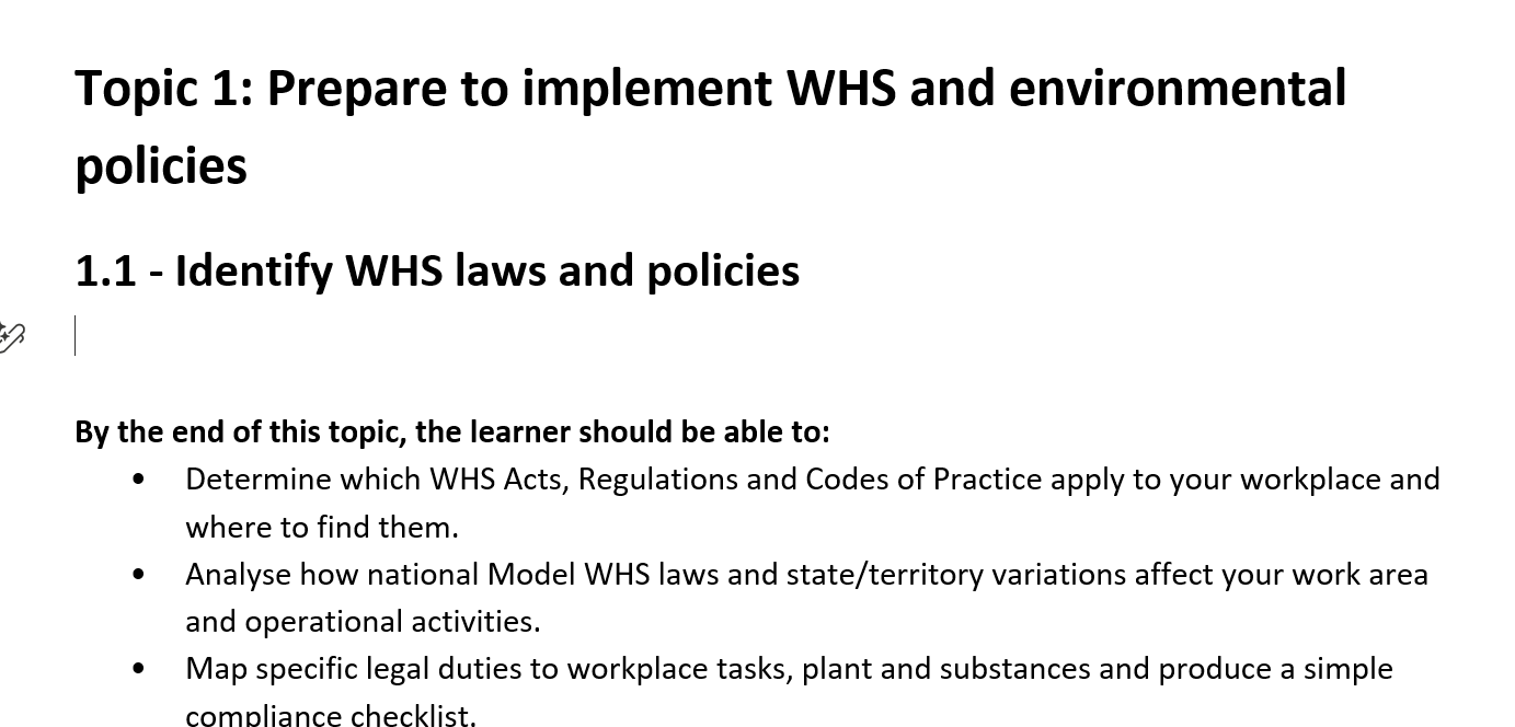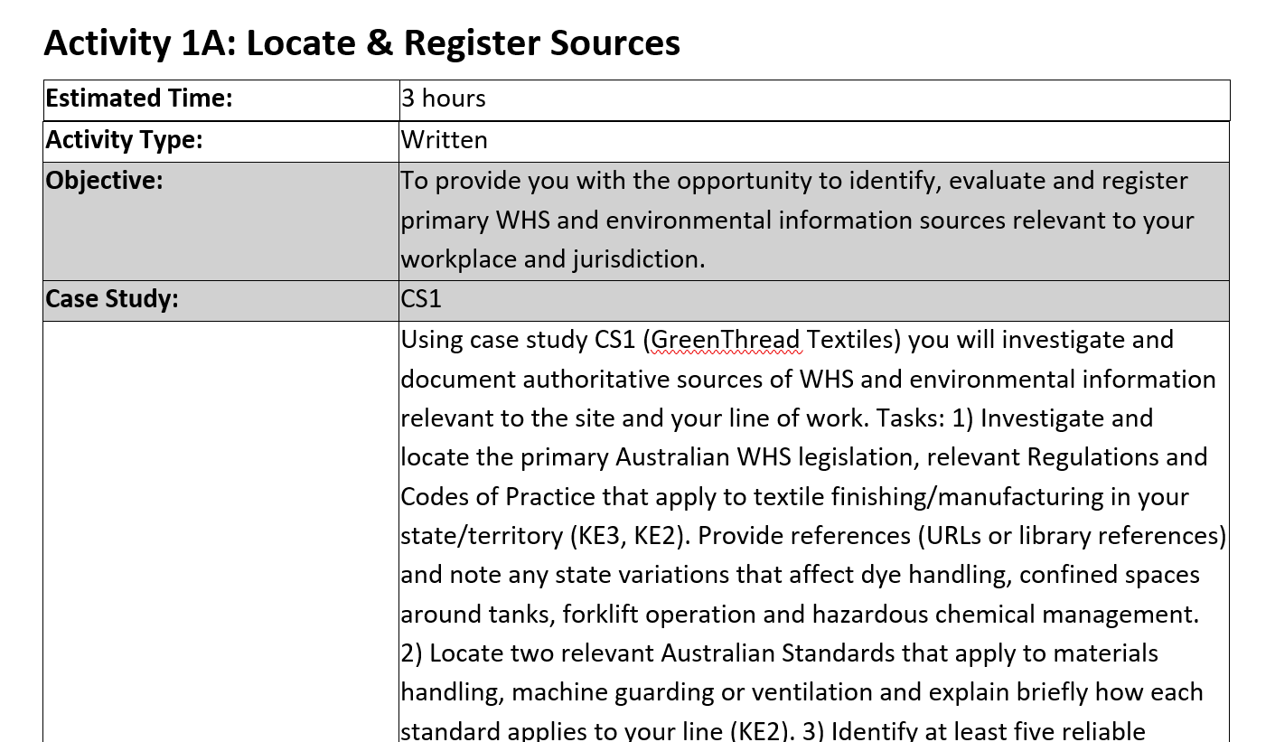 The Mapping Document links each assessment task to the required elements of the unit of competency. It helps ensure that all Performance Criteria, Knowledge Evidence, Performance Evidence, Assessment Conditions and Foundation Skills are covered. This section provides a basic checklist to help you review the structure and completeness of the mapping output generated in Coursebox.