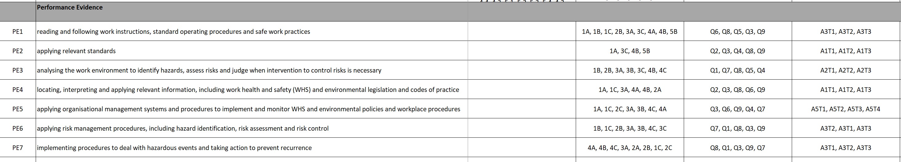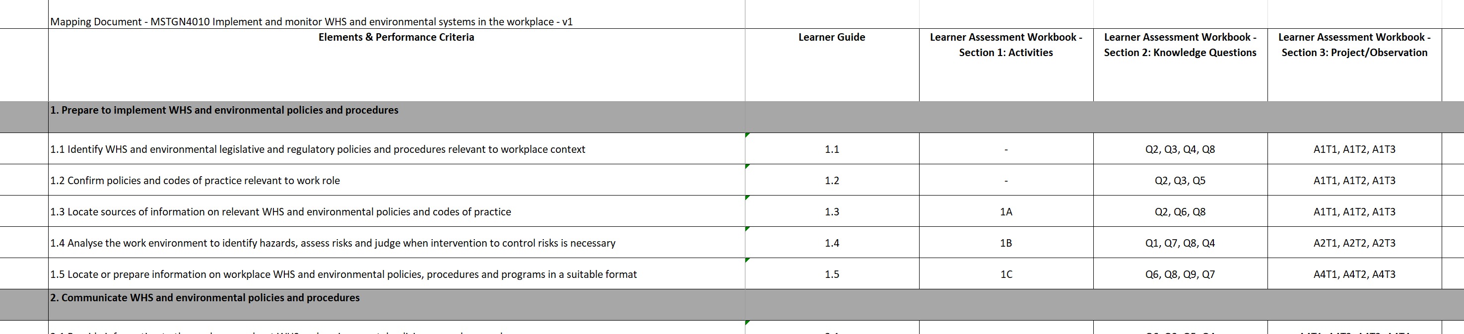 The Mapping Document shows how assessment tasks align with the unit’s Elements, Performance Criteria, Knowledge Evidence, Performance Evidence, Assessment Conditions and Foundation Skills.