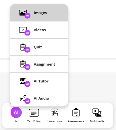 Coursebox lets you create custom visuals using AI image generation. You can access this feature as above or from the bottom menu clicking on AI > Images