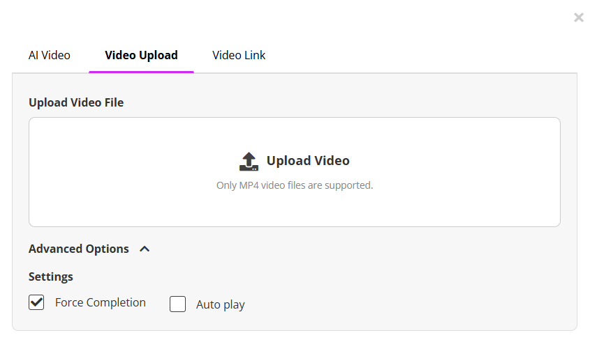 - Force completion: This will mean that the learner must watch the entire video before progressing