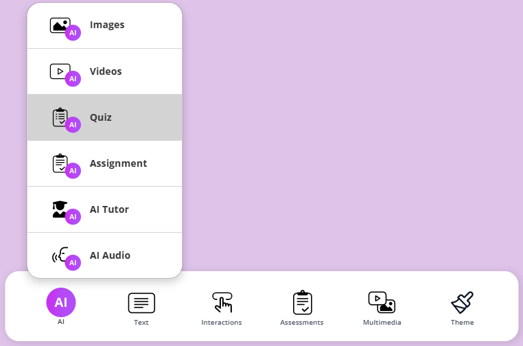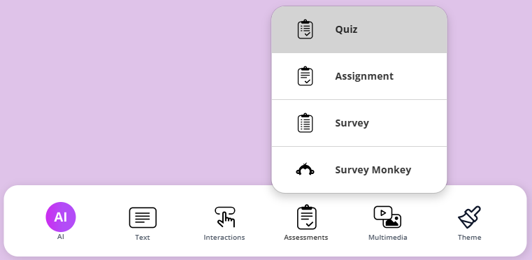 Quizzes can include various question types and are a great way to check knowledge, provide feedback, and keep learners actively engaged throughout the course.
