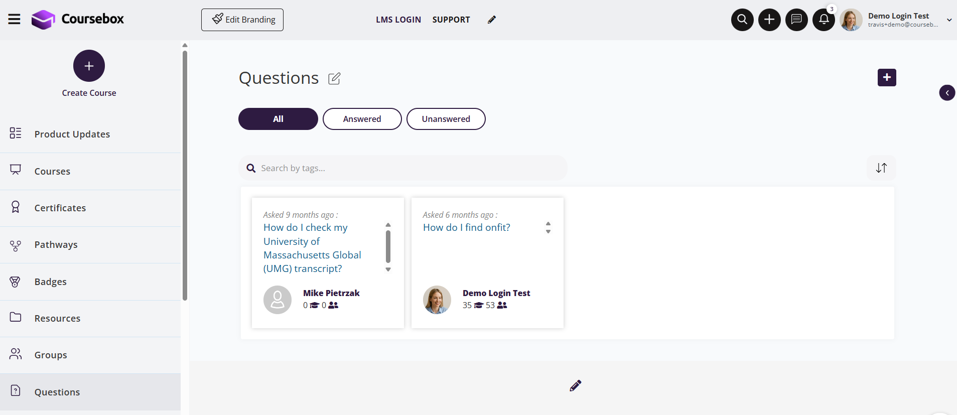 The questions section is an in-built discussion forum of Coursebox Branded Training Platform (Premium) where community members can ask and answer questions.