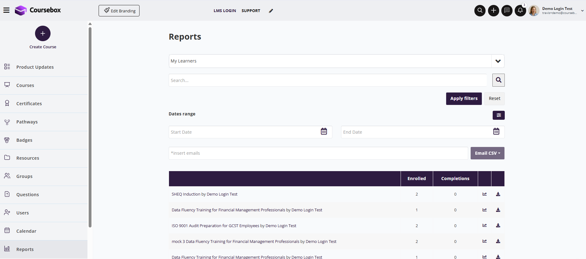 For Business & Enterprise Accounts only. To upgrade your account go to: https://www.coursebox.ai/pricingCoursebox Branded Training Platform (Premium) includes a robust Reporting and Analytics dashboard designed to help Super Administrators and Facilitators monitor learner activity, track progress, and evaluate course effectiveness.