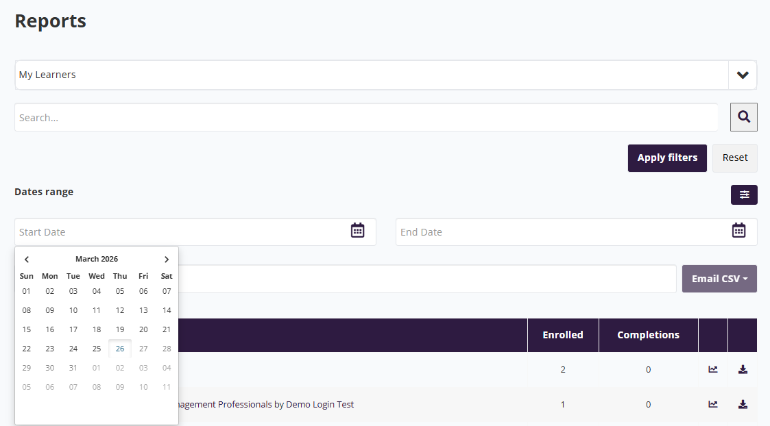 These reports provide insight into learner progress and engagement, either for your own courses (My Learners) or across the entire platform (All Learners). You can view interaction trends, completion status, and download detailed .CSV reports for analysis.