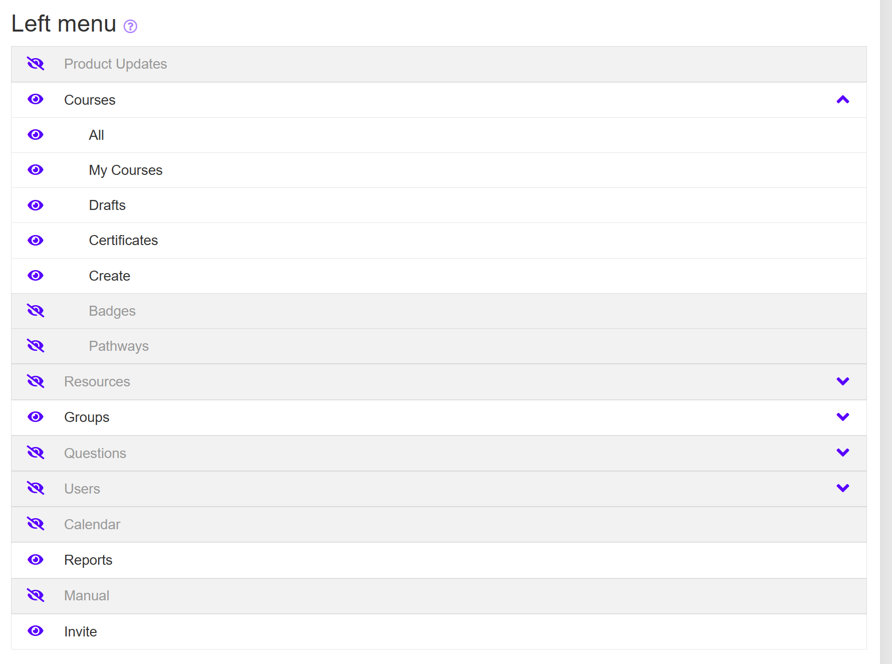 As a Super Admin, you can control which items appear in the left-hand navigation menu of your portal. This allows you to simplify the learner experience by hiding pages or features that are not relevant to your users.