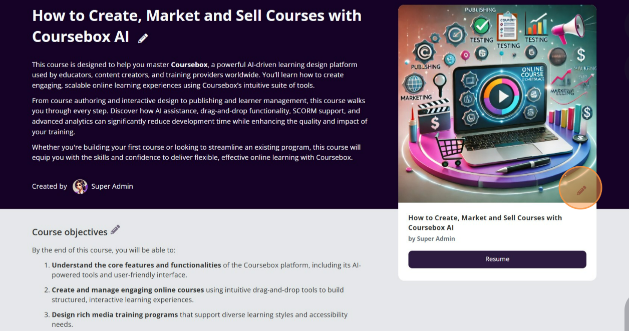 This section explains how to customise the visual appearance of an individual course in Coursebox. It covers updating the course cover image, selecting fonts, and adjusting colours so your course aligns with your branding and delivers a consistent, professional learner experience.