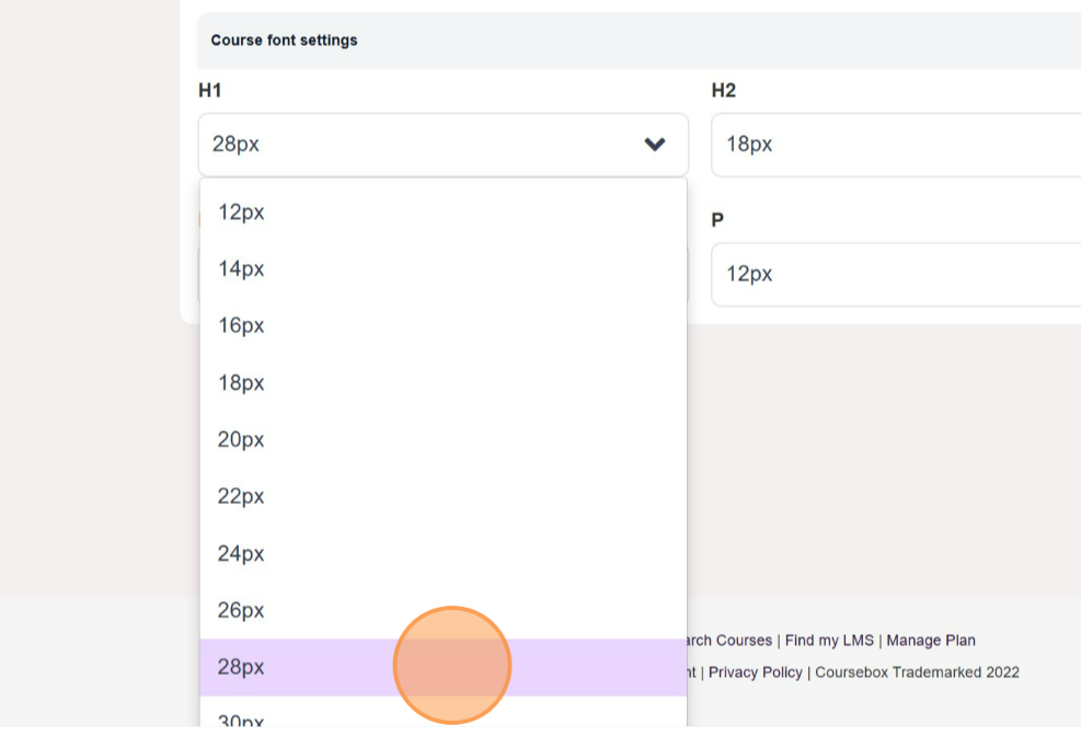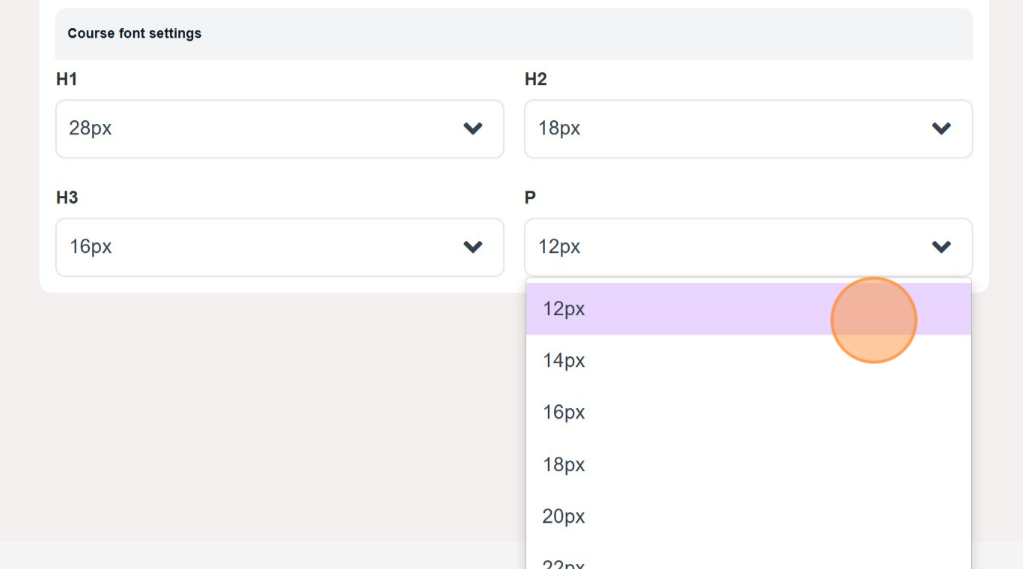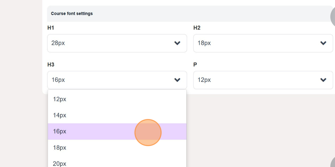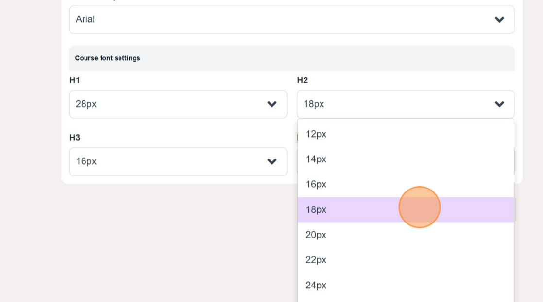 Select a font family for your course theme using the Font Family dropdown. This font will be applied across headings and body text according to the sizes you set below.