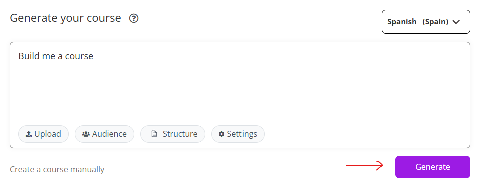 Select the language in which you want to write (using the drop down menu at the top right, shown below). Then in the 'generate your course' text box, describe your course. We'd recommend being as detailed as you can here, as the more thorough you are, the better tailored the content will be.
