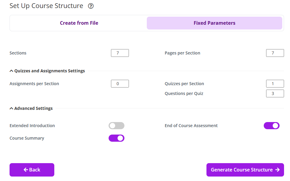 NOTE: You can modify the structure by using a file (create from file). This is where you could upload documents that describe your course curiculum, topics breakdown or other such details. Alternatively, you could go into the fixed parameters and modify the structure that way (as shown below)