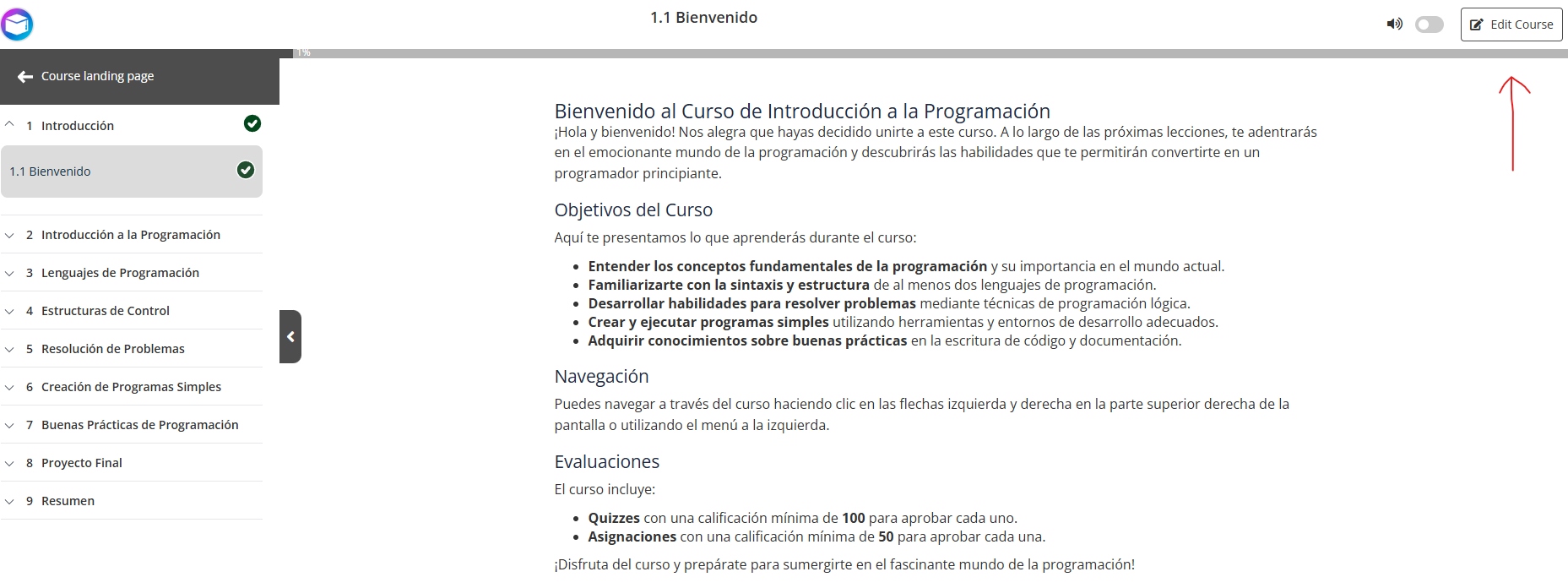 - Edit the course: Click the 'edit course' button at the top right in order to start modifying the content that's been generated.