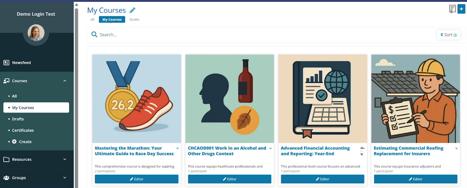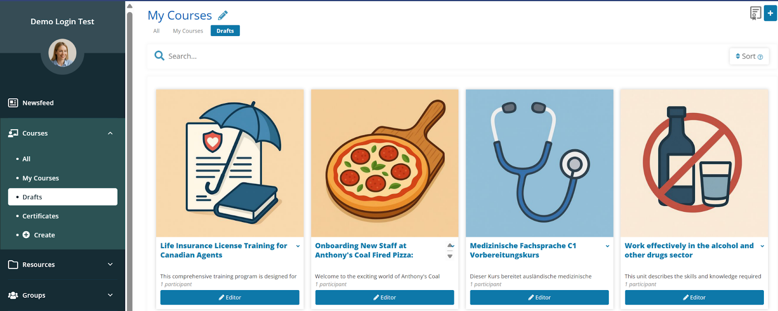 The Drafts section allows you to manage content that’s still in progress. Whether you're working on a new course or editing existing modules, this is where all unsaved or unpublished changes are stored. Use this area to review, continue editing, or discard drafts before making them live to learners. It's your workspace for refining content before final publication.