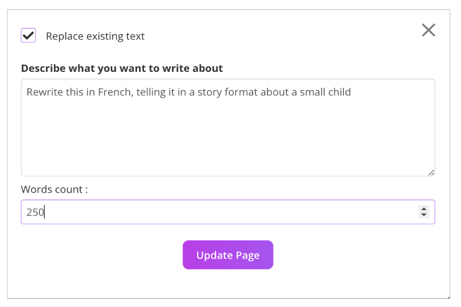 Within the Text Editor, click the purple “AI Writer” button. Enter your prompt (e.g., “Write a lesson summary about sustainability”), specify a word count, and click “Update Page.” You can choose whether to replace existing text or append the AI-generated content.