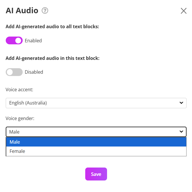 - Toggle Add AI-generated audio to all text blocks to the Enabled position (purple).