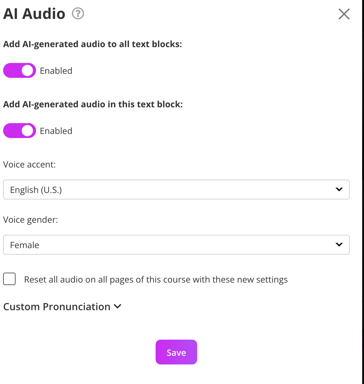 The AI Audio menu lets you control whether AI-generated audio is applied to your course text blocks. You can enable it for the entire course or for individual sections.