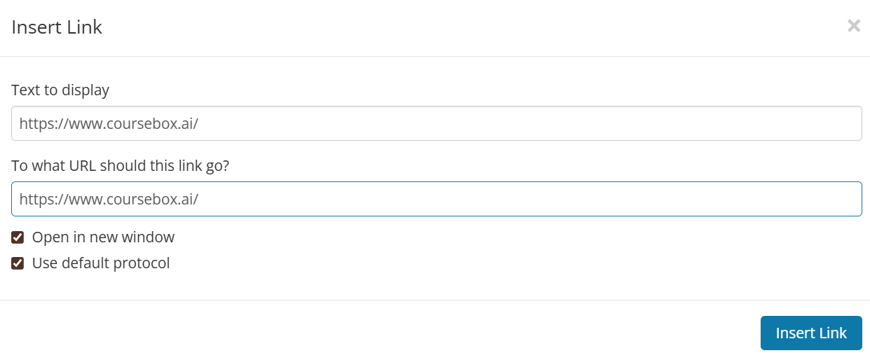 To what URL should this link go?: Paste your web address (e.g., https://www.coursebox.ai/).