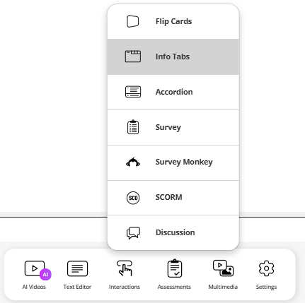 To boost learner engagement, you can add Flip Cards (for flashcard-style learning), Tabs (for separating content cleanly), or Accordions (for expandable text blocks). These tools help chunk information, making your course more visually appealing and easier to digest.