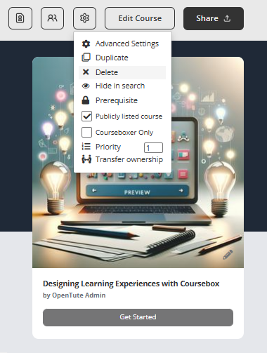 The Delete function allows you to permanently remove a course from your drafts or course list. This is useful if the course is no longer needed or was created by mistake.
