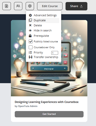 The Duplicate feature lets you create a copy of an entire course, which will appear in your Drafts. This is a valuable time-saving tool when you want to reuse an existing course structure.