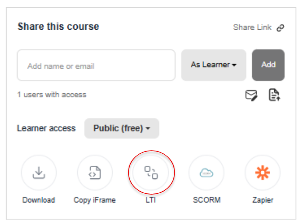 - Open the Course in Coursebox, click on share button and click on LTI.