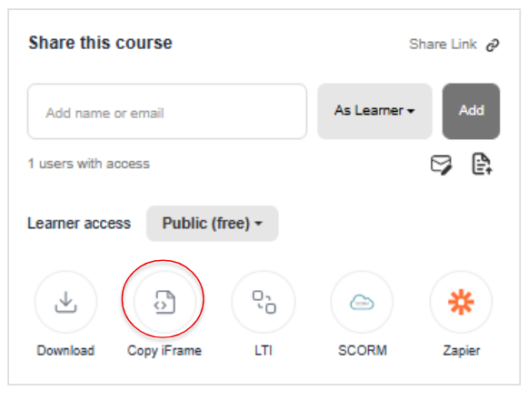 - On any course, navigate to the course page and click the share icon > copy the iframe to copy the code.