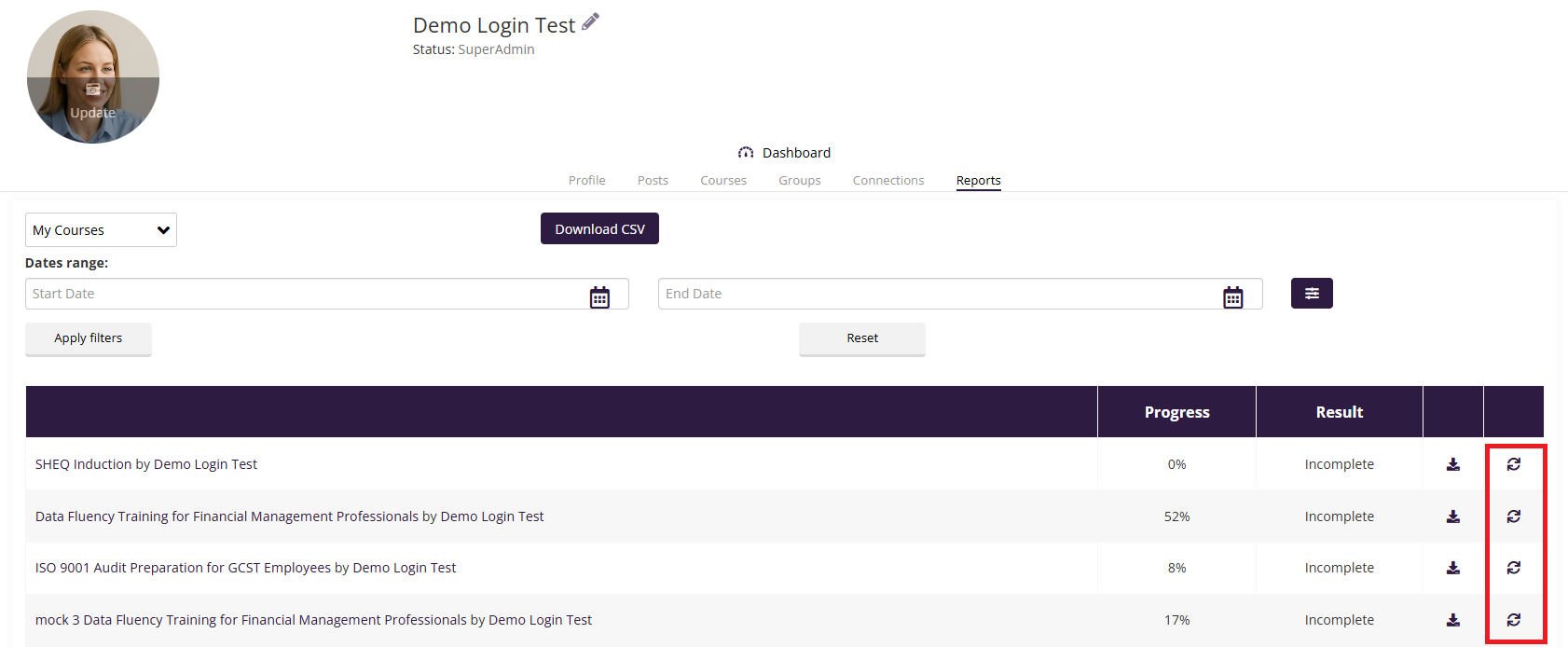 Click the circular arrow icon next to the course under the Result column.