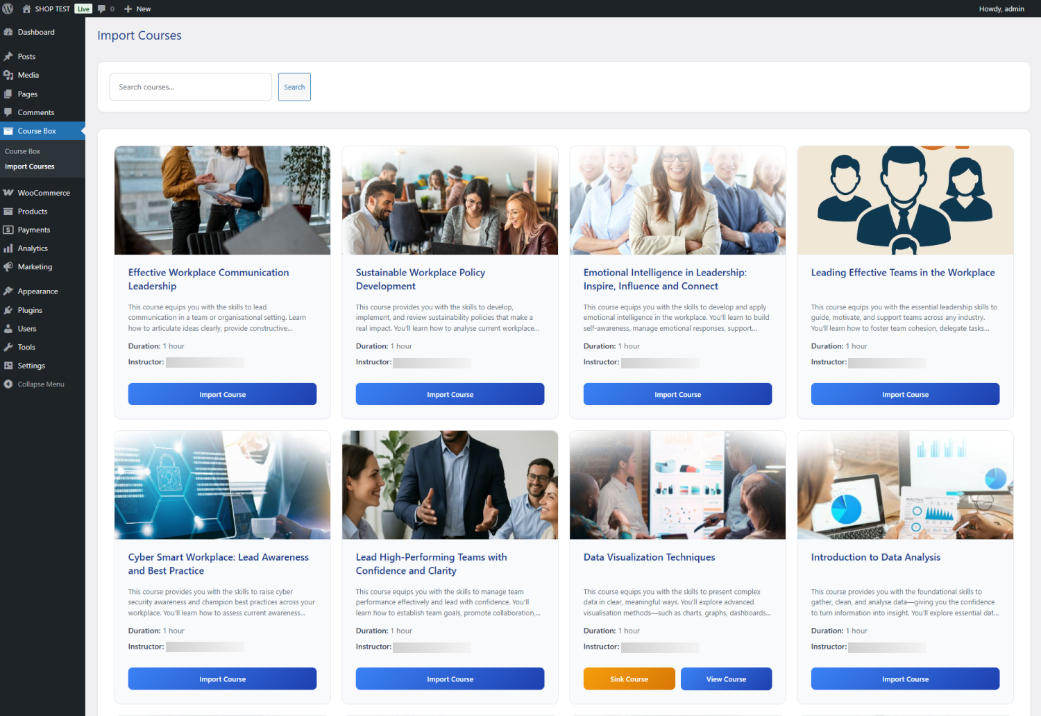 Navigate to Course Box → Import Courses. Here, you’ll see all your available Coursebox courses with images, descriptions, and import options. Simply click Import Course to bring a course into your WooCommerce store.