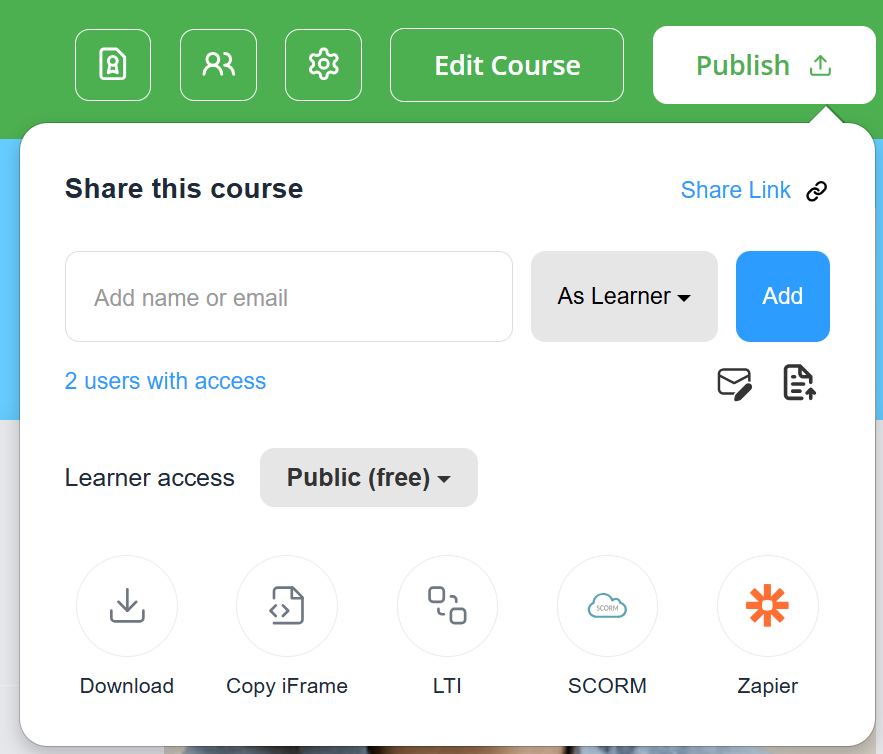 Open your course and click Publish this course.