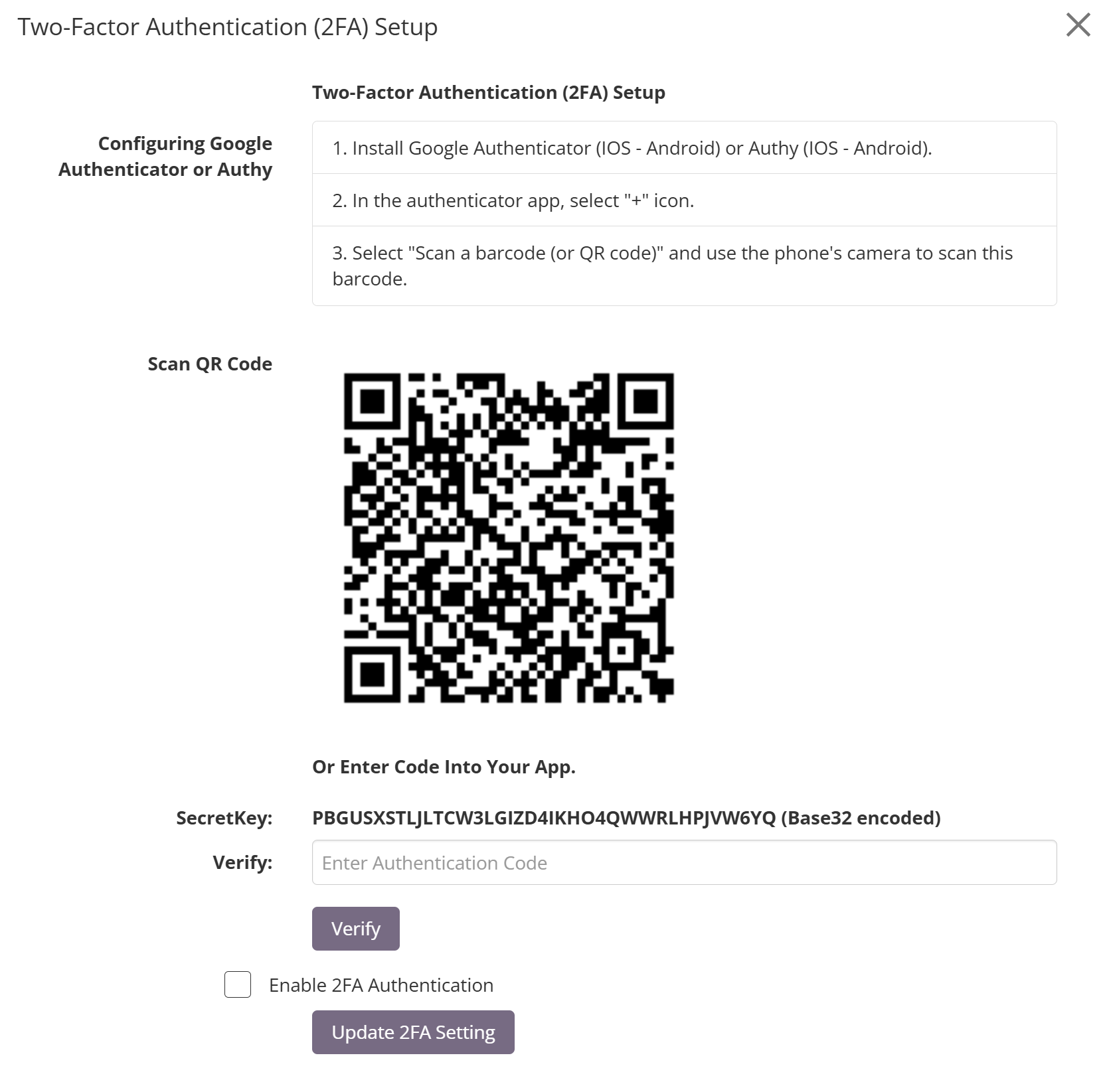 This will open the Two-Factor Authentication setup window
