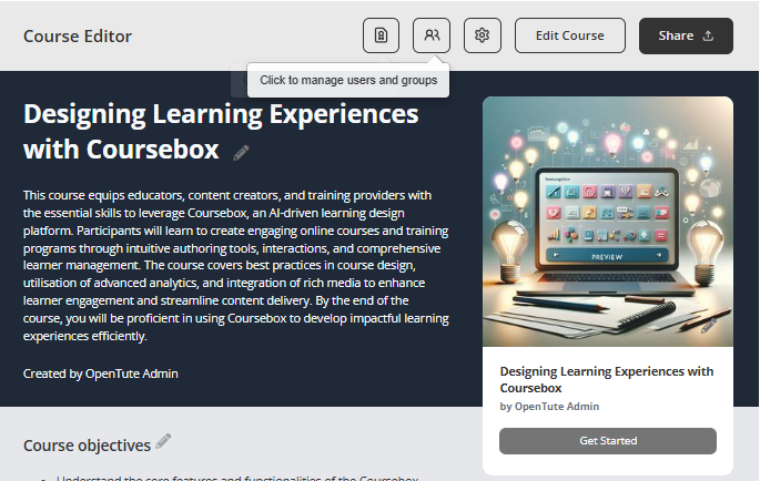This feature allows course administrators and facilitators to efficiently manage learner enrolment and collaboration settings within Coursebox. From this section, you can add or remove users, assign learners to specific groups, and control access to course content. Managing users and groups ensures a personalised and organised learning experience, allowing you to tailor content delivery, track progress by group, and streamline communication across cohorts. Whether you're working with individual learners or managing large training cohorts, this tool is essential for effective learner engagement and course management.