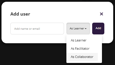 Adding a Collaborator gives that person access to your course so they can view, support, and contribute to its development. This is also where you can grant access to team members from the Coursebox Branded Training Platform (Premium) if they are assisting you.