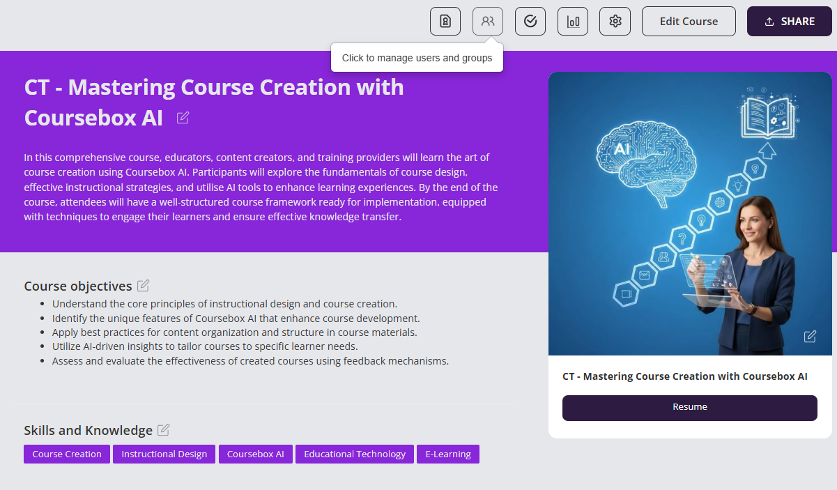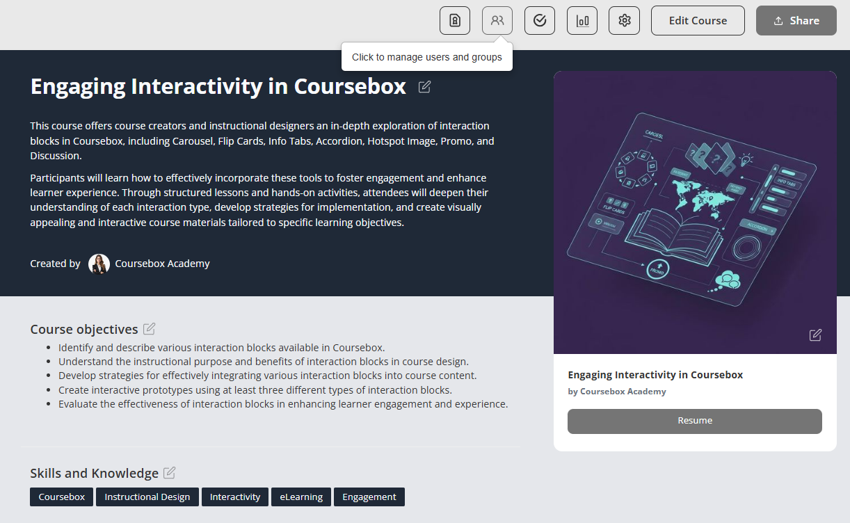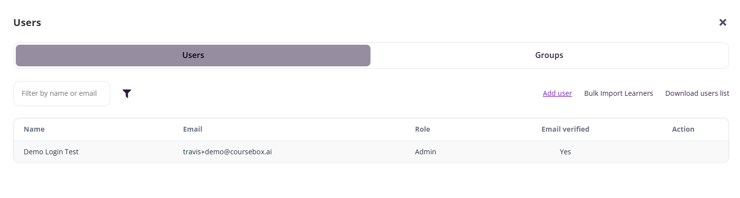 This feature allows course collaborators and facilitators to efficiently manage learner enrolment and collaboration settings within Coursebox. From this section, you can add or remove users, assign learners to specific groups, and control access to course content. Managing users and groups ensures a personalised and organised learning experience, allowing you to tailor content delivery, track progress by group, and streamline communication across cohorts. Whether you're working with individual learners or managing large training cohorts, this tool is essential for effective learner engagement and course management.