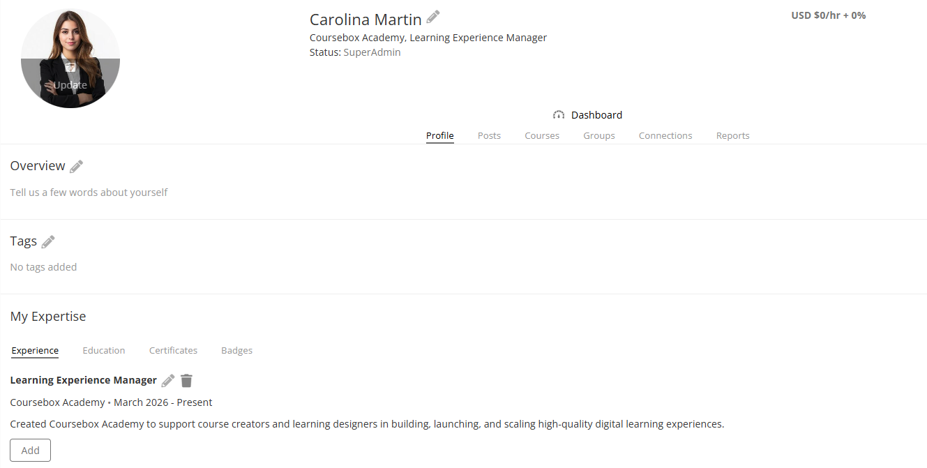 Every member of the Coursebox Branded Training Platform (Premium) is provided with a personal profile page. This profile helps learners showcase their identity, learning progress, and contributions within the community. It also enables peer connection and expert visibility, making learning more social and engaging.