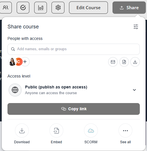 - In the top-right corner of the course editor, click the Share button.