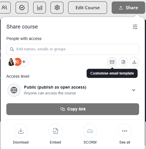 - In the same Share this course panel, click the email icon (envelope) to open the Customise Invitation Email window.