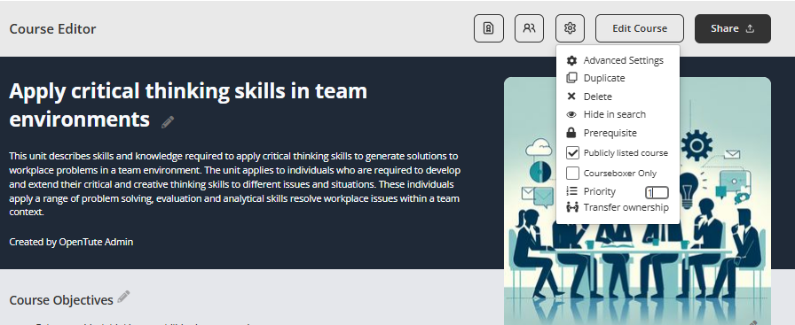 This topic explains how to navigate your courses in Coursebox and configure key settings that control how a course is displayed, accessed, assessed, and managed. It covers course navigation views, advanced configuration options, ownership and visibility controls, and tools for organising, duplicating, and maintaining courses throughout their lifecycle.