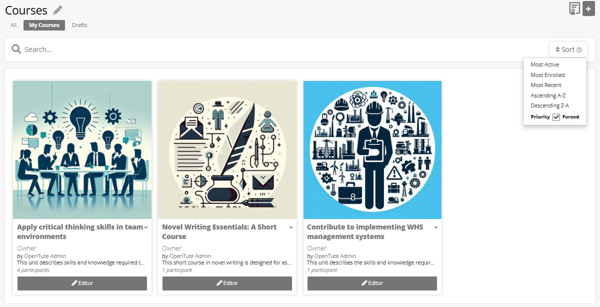 Course priority helps control the display order of courses for learners and admins. By assigning a numeric value to each course, you can ensure high-priority courses appear more prominently—especially when using the "Priority Forced" sort option. This is particularly useful for spotlighting featured, time-sensitive, or compliance-mandatory courses.