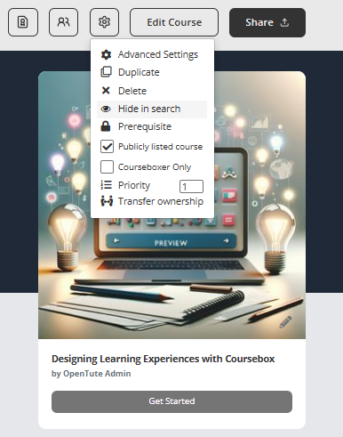 If you prefer to keep a course hidden from search results, you can use the Hide in Search option. This prevents others from discovering the course until you're ready to share it. When you're ready to make the course visible again, simply click Make Visible to restore its discoverability.