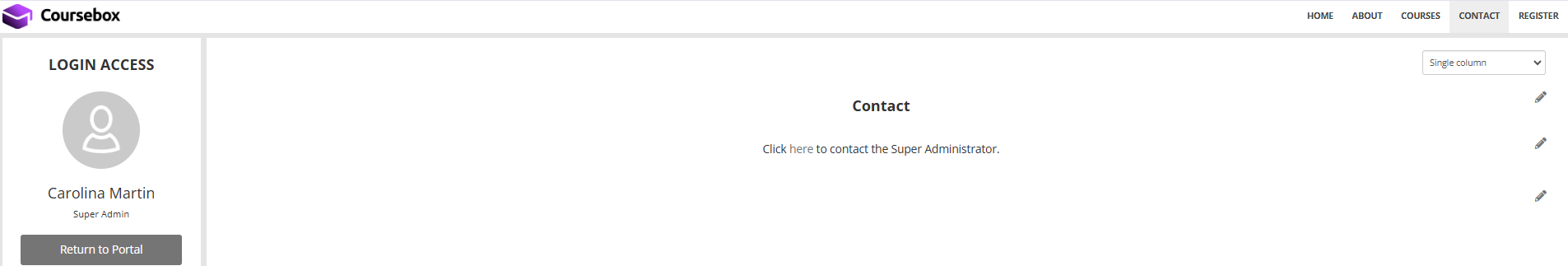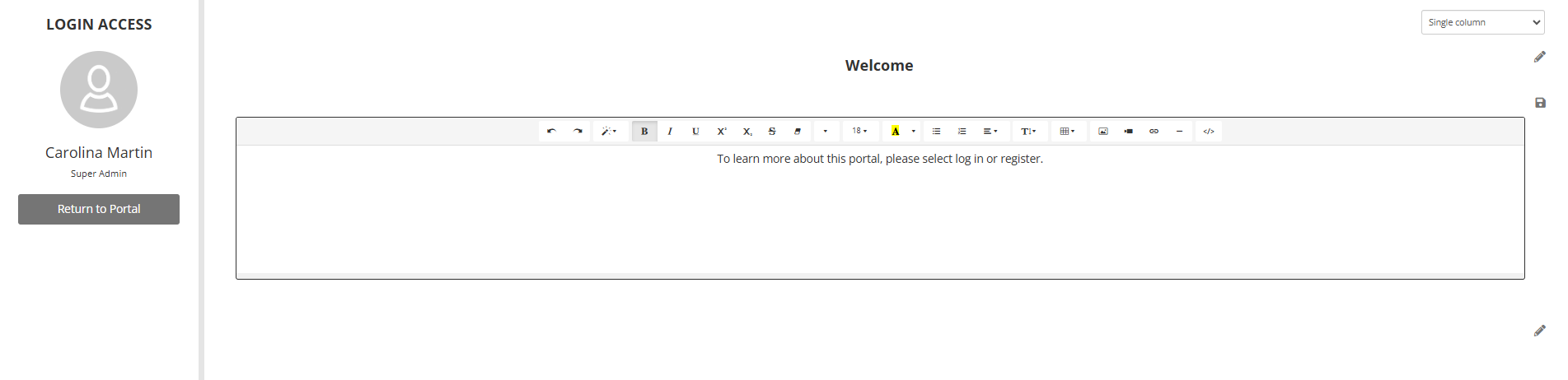 To edit the footer as Super Admin, scroll down to the bottom of any page, click the pen icon, make changes and then click save.