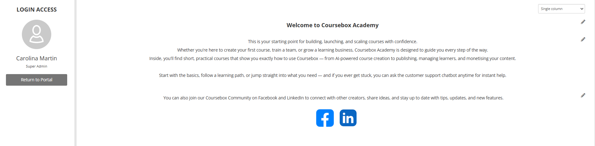 This section explains how Super Administrators can create and manage the welcome post that appears for new users. The welcome message helps set the tone, provide guidance, and introduce learners to the platform experience from their first login.