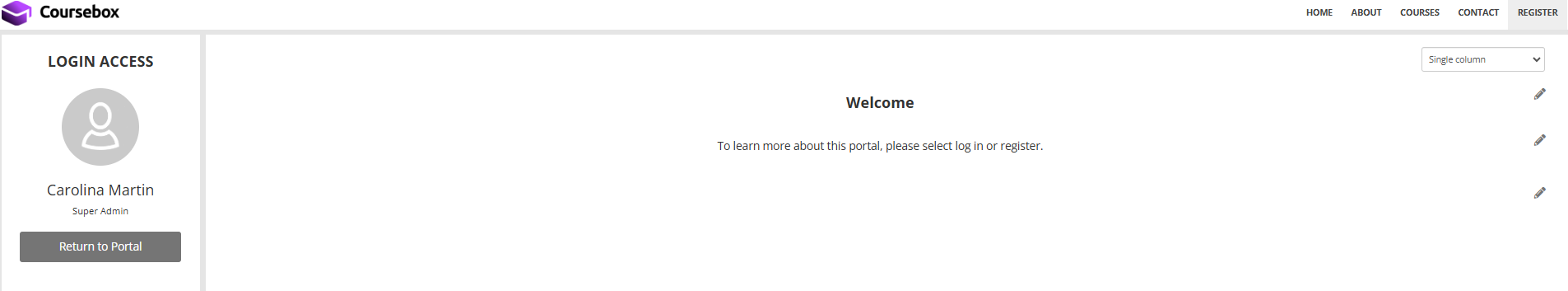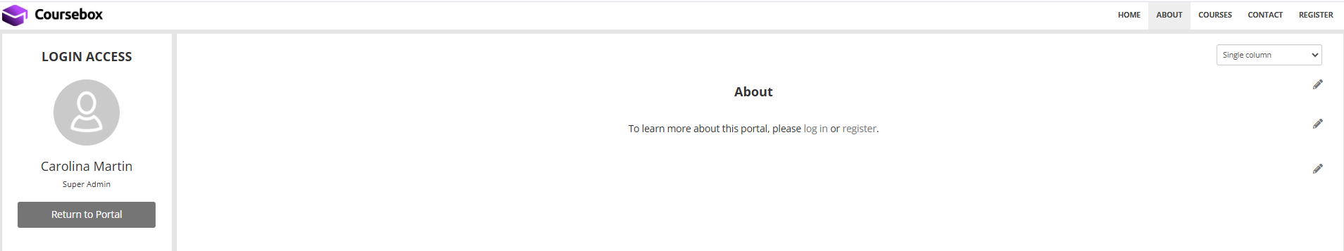 Similar to Home page, About page provides 3 content blocks which you can edit. By default, the description content block contains a standard text block that provides hyperlink to the LogIn and Registration page.