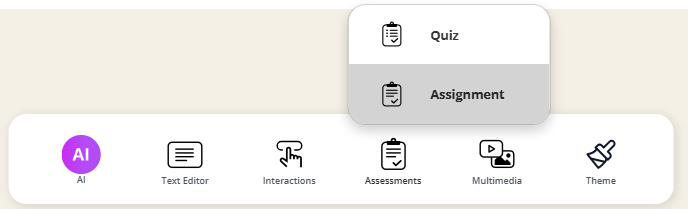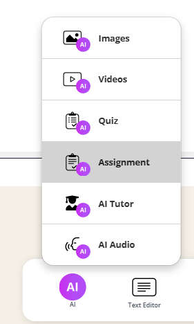 The AI Assignment Writer helps you quickly generate clear, well-structured assignment instructions by entering a short prompt. You can use it to create scenario-based tasks, explore specific topics, or expand on existing content—saving time while maintaining quality.