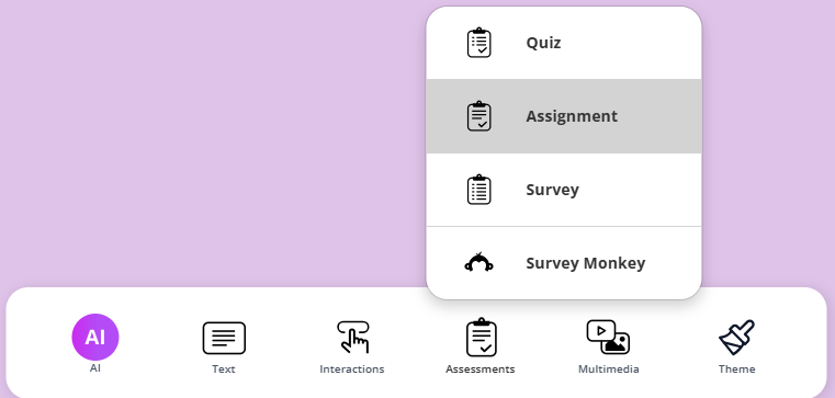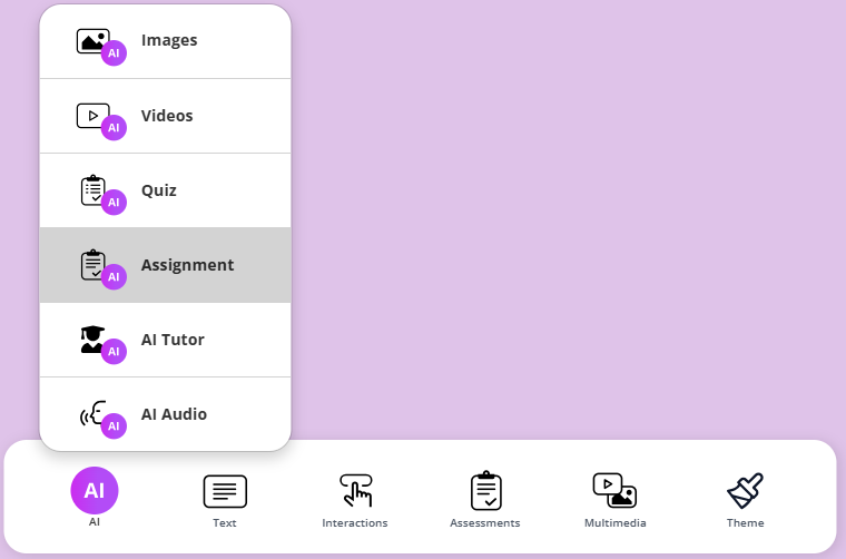 Click the AI button and select Assignment to generate an assignment using AI.