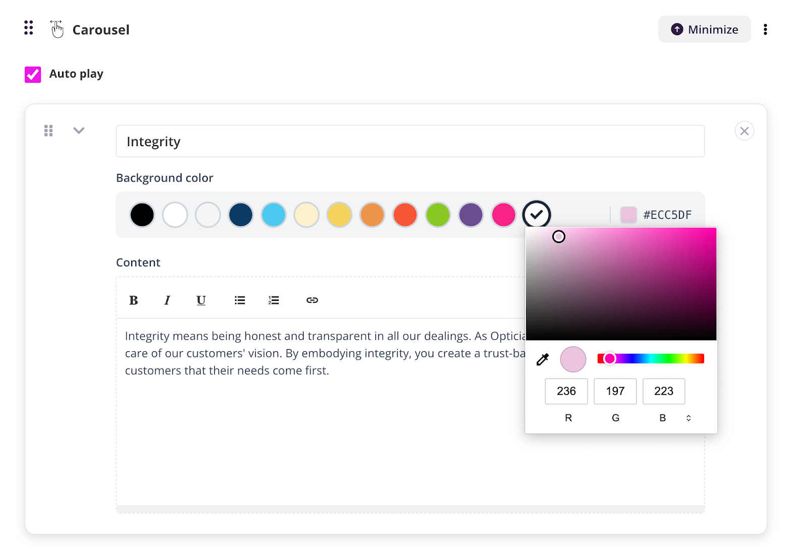 • Set colours with a picker or paste a HEX code