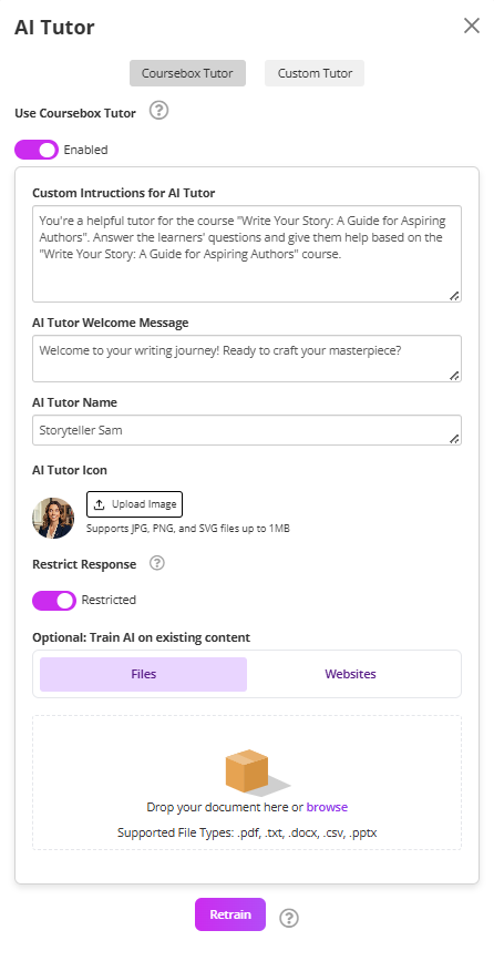 • You can edit the Tutor name, image and train it on the course or other documents.