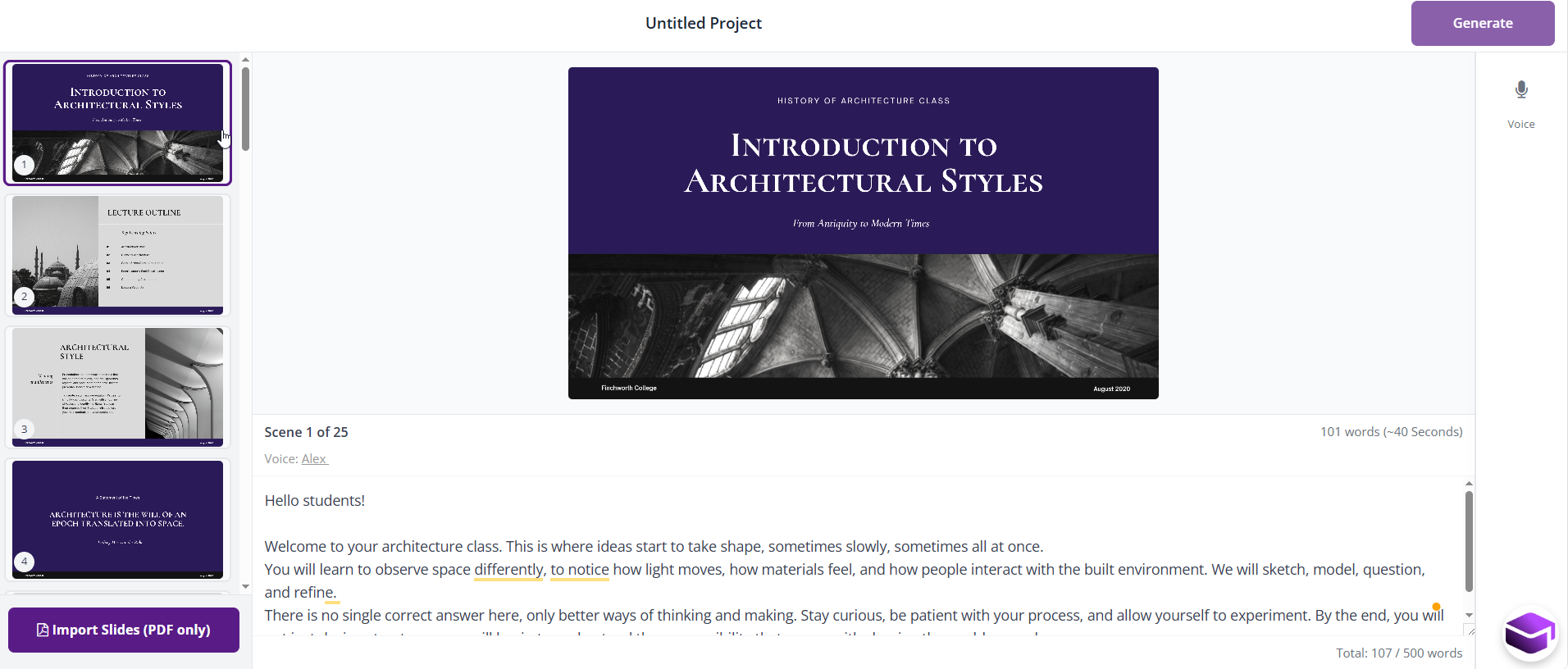 • Edit the script for each slide before generating