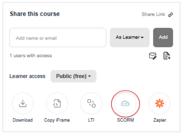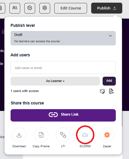 On the publish settings page, publish your course and click the share button to then select the version of SCORM required for upload to your LMS.